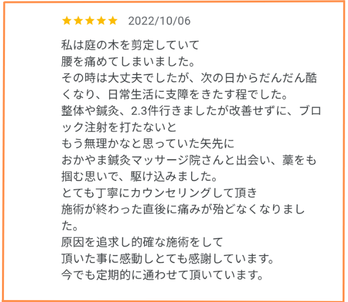 患者さまの声 okayama masakazu 女性50代 めまい・吐き気・不安感・パニック障害 女性40代 めまい・耳鳴り 男性40代 めまい 女性60代 めまい 痛みでお悩みの方もいらっしゃっています 女性60代 膝の痛み 五十肩 女性50代 ぎっくり腰 男性30代 首肩痛 不眠 女性90代 往診患者さま 免疫力向上、健康維持 施術中でお電話に出れない場合が多々あります留守番電話へのメッセージにご協力ください
